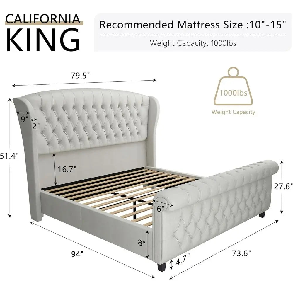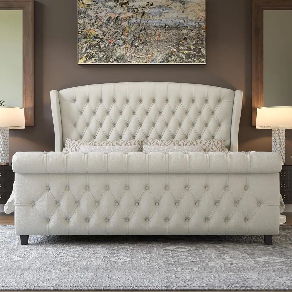 California King bed, velvet sleigh bed, wingback headboard, button tufted footboard, cream upholstered bed, luxury bedroom furniture, modern sleigh bed, no box spring bed, premium home décor, elegant bedroom design