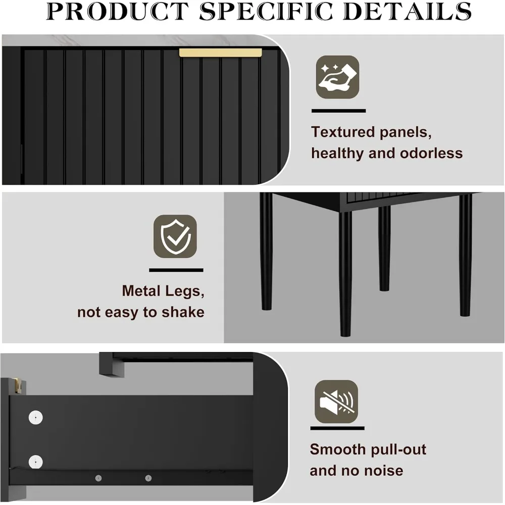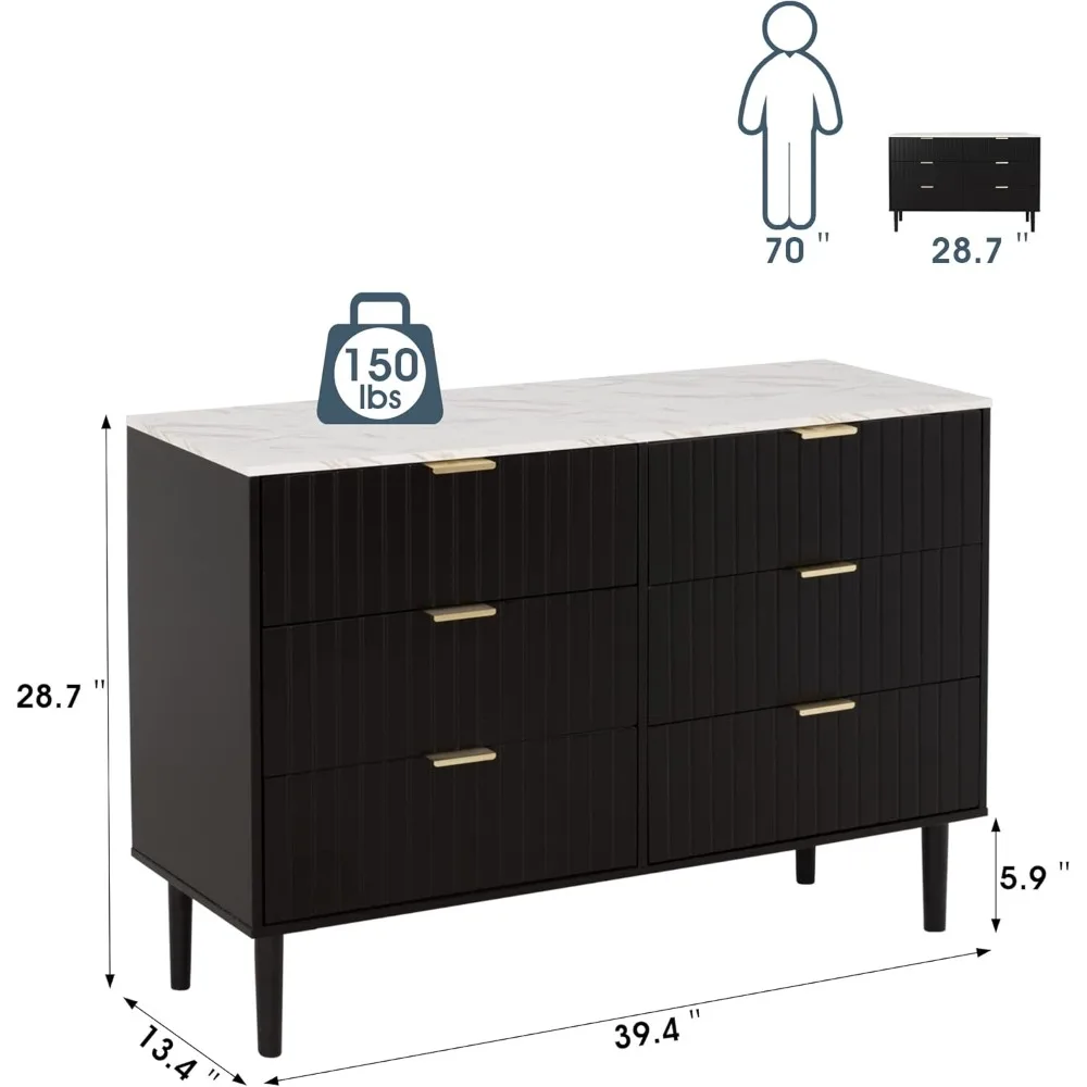 This product offers a stylish and modern bedroom furniture set that includes a 6-drawer dresser and a pair of nightstands. The simple design of the furniture makes it versatile for use in various settings, such as offices, bedrooms, and kitchens. The dresser measures 13.38 inches in depth, 39.37 inches in width, and 29.53 inches in height, while each nightstand has dimensions of 16.7 inches in width, 15.7 inches in depth, and 26.8 inches in height. Each drawer can hold up to 20lbs. The furniture is made from durable MDF, an eco-friendly material that ensures long-lasting use and is resistant to scratches and water damage. It is also easy to clean and maintain. Assembly is required, but all necessary hardware and an instruction manual are provided to make the process straightforward. The product comes with a one-year warranty, and our service team is always available to assist with any issues that may arise.