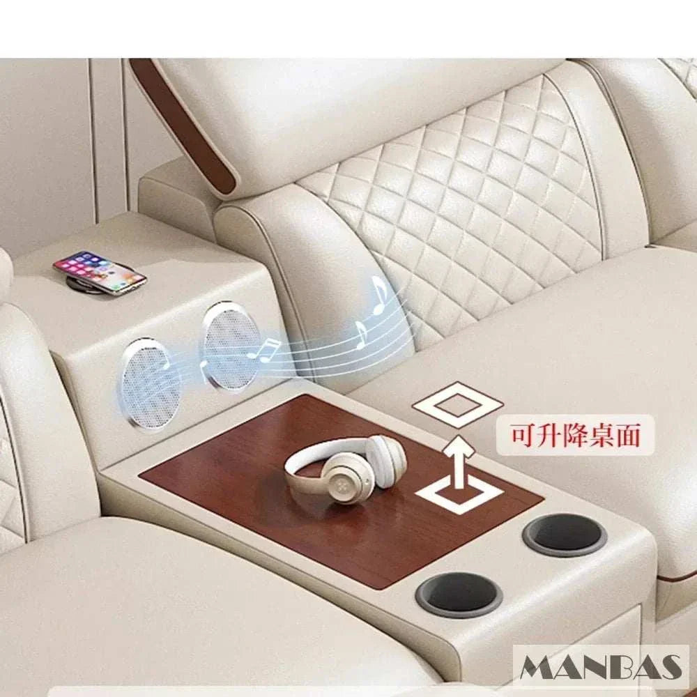 Premium Italian genuine leather sofa set with adjustable headrests, built-in Bluetooth speakers, and wireless charger in modern design