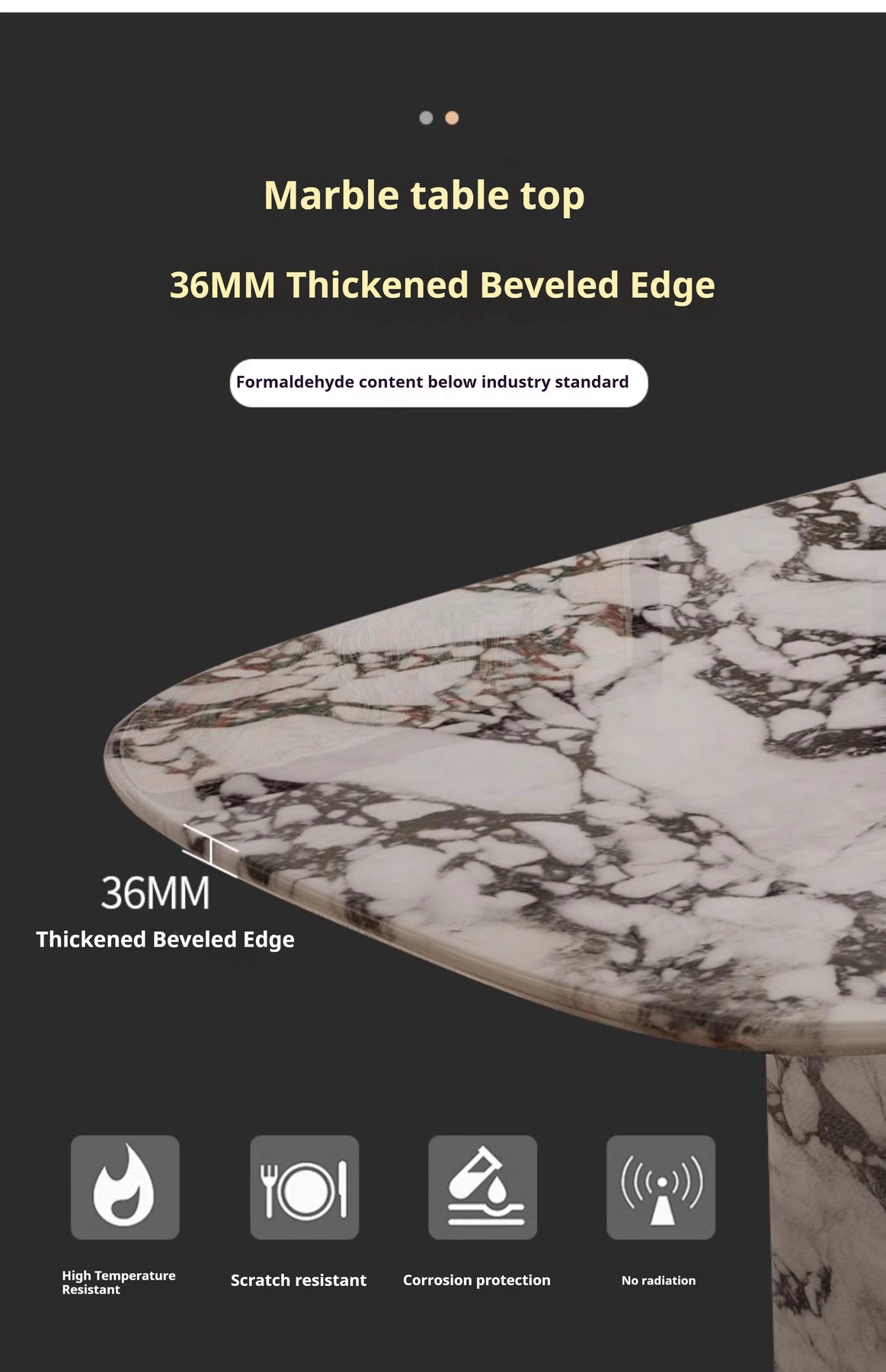Marble table top with 36MM thick beveled edge on a black background